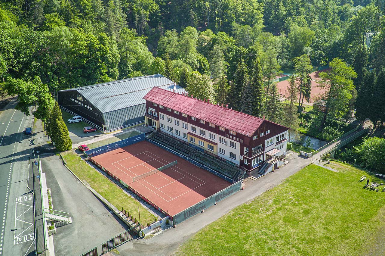 Náš komplex nabízí 9 prvotřídních tenisových kurtů, jednu z nejmodernějších a největších tenisových hal v Česku se 4 kurty, multifunkční halu na badminton se 6 kurty a také hotel s 26 pokoji.